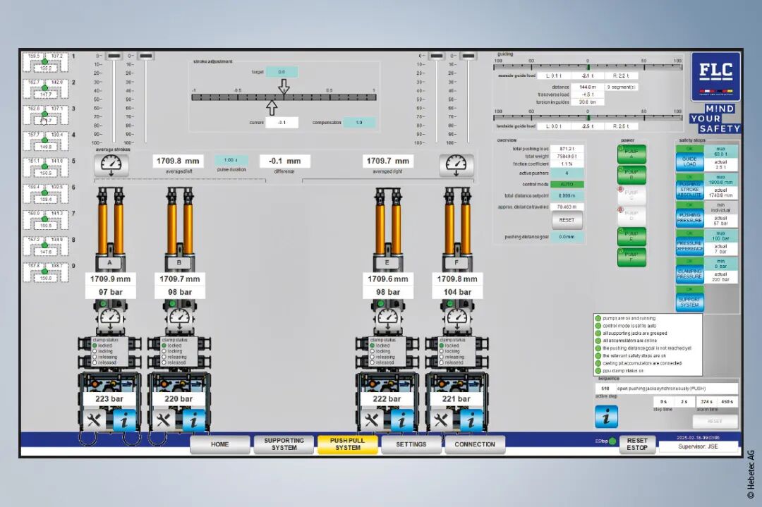 在整个流程中,巨型隧道管节通过液压支架调平后,由液压千斤顶向前推移数百米。该方案由瑞士欣德尔班克的 Hebetec 公司研发,并与位于基尔希贝格的倍福解决方案供应商 Elpex 公司合作实现自动化。“将最终长达 200 余米、宽 43 米的管节安全、精确地从混凝土浇筑车间移运至港池,是一项真正的挑战。”Hebetec 公司运营总监 Olivier Briguet 强调道。每条生产线由六个行程达 1.8 米的双液压缸驱动,这些液压缸安装在可移动框架上,通过夹爪紧贴在滑移梁侧面。六个液压千斤顶均匀地向前推进管节,随后松开夹紧装置并回缩,在此过程中被向前牵引,继而开启新一轮循环作业。