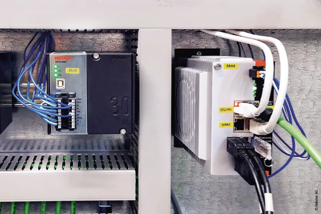 “粗略估算,我们铺设了约 4.5 公里供电电缆、3.5 公里 EtherCAT 通信电缆及 67 公里控制电缆。”Urs Krähenbühl 在概述项目规模时说道。“ EtherCAT 灵活的拓扑选择为布线工作提供了极大便利。”软件团队负责人 Benjamin Schwab 补充道。这使得分布在隧道管节上的蓄能器可采用线型拓扑连接,而生产线上的顶推装置则通过 8 端口 EtherCAT 拓扑扩展模型 CU1128 实现星型拓扑连接。”