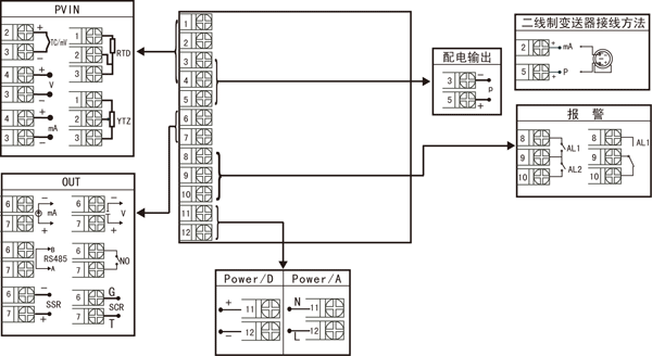 | 注:上述接线图中在同一组端子标有不同功能的,只能选择其中一种功能。如RS485通讯功能和控制输出功能在同一组OUT接线端子上,只能选择一种。若两者需同时存在时,控制输出只能选择开关量输出且接线端子在AL2上。 |