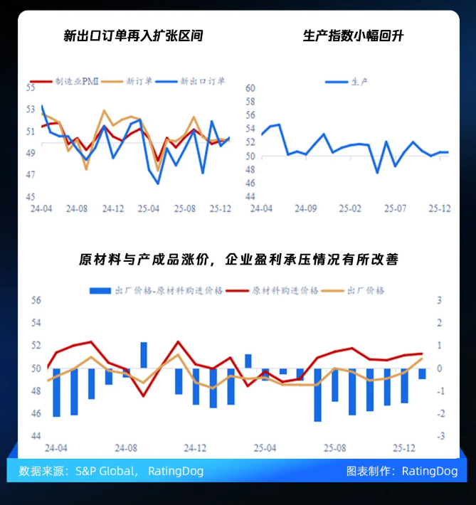 2026年1月,RatingDog中国制造业PMI录得50.3,较2025年12月的50.1上升0.2,制造业景气度延续温和改善,读数表现强于去年同期水平50.1并持平于近一年均值50.3。