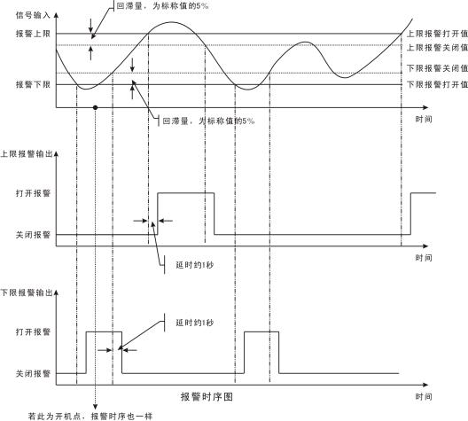 Á½Â·ÎÞÔ´´¥µãÊä³ö¡£¶ÔͬһµçÁ¿£¨Èçµçѹ£©½øÐÐÇø¼ä±¨¾¯£¬³£¿ª´¥µã±¨¾¯Êä³ö£¬Ôڼ̵çÆ÷ÎüºÏµÄͬʱ£¬Ö¸Ê¾µÆ½»ÌæÉÁ˸ÏÔʾµ±Ç°Öµ¡£ÏÂͼΪ±¨¾¯Ê±Ðòͼ