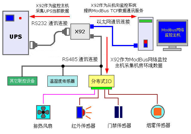 | X92 UPS ͨѶ·þÎñÆ÷ÊÇÕë¶ÔUPS½ÓÈëµ½ModBus×ÜÏߺÍÒÔÌ«Íø¼à¿ØÍøÂç¶øÉè¼ÆµÄ£¬X92ͨ¹ýUPSÌṩµÄRS232ͨѶ½Ó¿Ú¶ÔUPS½øÐÐ¼à¿Ø£¬°Ñ²É¼¯µ½µÄÊý¾Ý£¨ÈçÊäÈëµçѹ£¬Êä³ö¸ºÔصȲÎÊý£©±£´æµ½Êý¾Ý½»»»ÖÐÐÄ£¬ÕâÑù¼à¿ØÖ÷»ú¾Í¿ÉÒÔͨ¹ýX92 RS485ͨѶ¿ÚÌṩµÄModBus RTU/ASCII·þÎñ£¬»òÕßÒÔÌ«Íø½Ó¿ÚÌṩµÄModBus TCP·þÎñ£¬ÊµÏÖ´ÓModBus ×ÜÏß»òÕß¾ÖÓòÍøÉ϶ÔUPS½øÐÐ¼à¿Ø¡£ | |
