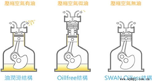 Ò»°ãÎÞÓÍʽ¿Õѹ»úΪOilfree½á¹¹£¬ÔËת¹ý³ÌÖÐÓÐÓÍ·Ý£¬½öѹËõ¿ÕÆøÖÐÎÞÓÍ·Ý£»µ«SWANÎÞÓÍʽ¿Õѹ»ú½á¹¹ÎªOilless½á¹¹£¬²»½öѹËõ¿ÕÆøÎÞÓÍ·Ý£¬Á¬ÔËת¹ý³ÌÒ²ÎÞÐèÌí¼ÓÈó»¬ÓÍ£¬Ìṩ¸ü½à¾»µÄѹËõ¿ÕÆø¡£