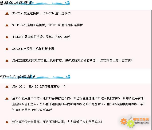 SR¿É·Ö±ðÓëSR-VPA¡¢SR-VPDÐÍÓïÒôÄ£¿é¼°SR-RCA¡¢SR-RCDÐÍÒ£¿ØÄ£¿éÅäºÏʹÓ㬿ÉʵÏֵ绰ң¿Ø¡¢ÎÞÏßÒ£¿Ø¡¢ÓïÒôÌáʾÒÔ¼°×Ô¶¯²¦´òµç»°ºÅÂëÖ®¹¦ÄÜ¡£¿ÉÒÔÓëÀ©Õ¹Ä£¿é£¨SR-20ERA,SR-20ERD£¬SR-20ETD£¬£¬SR-20EGD£©Á¬½ÓʹÓã¬À´À©³äÊäÈë/Êä³öµÄµãÊý£¬ÒÔÂú×ãÄúµÄ¿ØÖÆÐèÇó£»SRµÄ×î´óϵͳΪһ̨Ö÷»ú¼ÓÎą̊À©Õ¹Ä£¿é£¬×î´ó¿É´ï122¸öI/Oµã£¨74¸öÊäÈëµã£¬48¸öÊä³öµã£©¡£