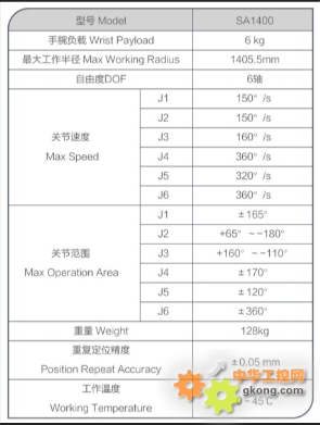 SA1400ÌØÐÔ£ºÊÖÍó¸ºÔØÎª6KG£¬×î´ó¹¤×÷°ë¾¶Îª1405.5MM¡£