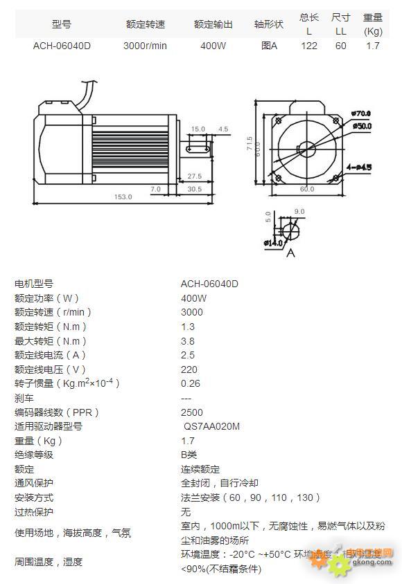 ÐͺţºACH-06040D, ¶î¶¨¹¦ÂÊ£¨W£©£º400W , ¶î¶¨×ªËÙ£¨r/min£©£º3000£¬