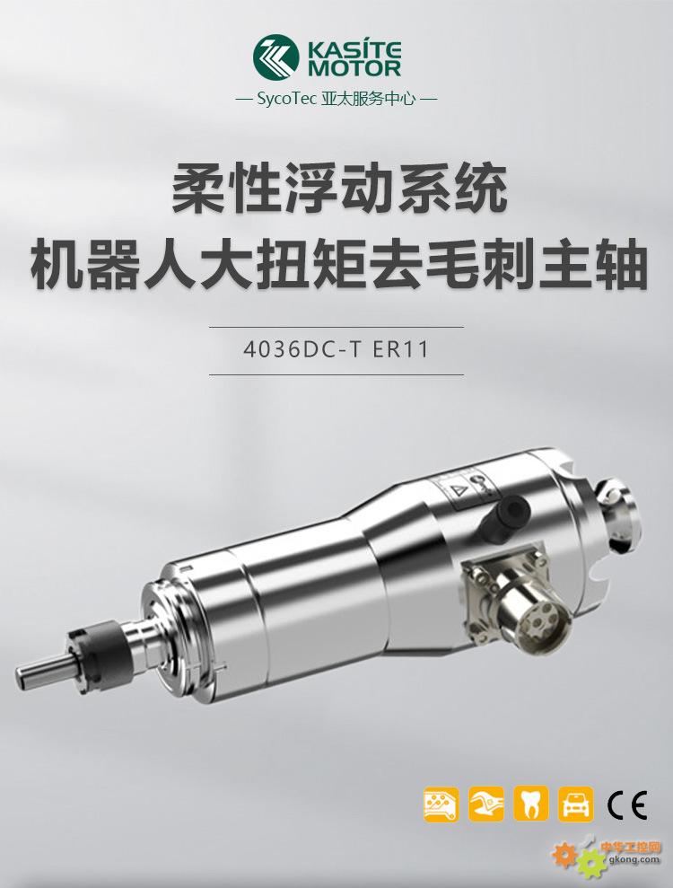 µÂ¹úSycotec 4036 DC-T-ER11¸¡¶¯Ö÷ÖᣬרΪÆû³µÂÖì±È¥Ã«´ÌÉè¼ÆµÄ¸ßËÙµçÖ÷Öá¡£¾ßÓдóŤ¾Ø¡¢¸ßתËÙ¡¢¸ß¾«¶È¡¢Ìå»ýС¡¢ÖØÁ¿ÇáµÈÌØµã£¬¼¯³ÉÁËÌØÊâµÄ¾¶Ïò + ÖáÏòÈáÐÔ¸¡¶¯ÏµÍ³£¬¿É×Ô¶¯ÊÊÅ乤¼þ±íÃæÐÎ×´ÓëλÖÃÎó²î£¬Í¨¹ýÆøÑ¹ÎÞ¼¶µ÷½Ú½Ó´¥Ñ¹Á¦£¬È·±£È¥Ã«´ÌÁ¦¶È¾ùÔÈ¡£×ªËÙ¿É´ï60,000RPM£¬¹¦ÂÊ850W£¬¾«¶È≤1μm£¬Ö§³Ö¼Ð³Ö8mmµÄµ¶¾ß£¬ÄÚÖÃÌÕ´ÉÇòÖá³ÐºÍPTCζȱ£»¤¹¦ÄÜ£¬±£ÕÏÁ˸ßËÙÔËתϵÄÎȶ¨ÓëÄ;á£
