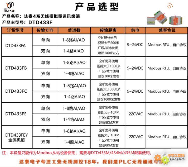 DTD433FÎÞÏßÄ£ÄâÁ¿ÖÕ¶ËÏ൱ÓÚÒ»¸ö4·ģÄâÁ¿ÊäÈëºÍ4·ģÄâÁ¿Êä³öµÄÎÞÏß±äËÍÆ÷£¬ËüÌṩÁË4AIºÍ4AO£¬·ûºÏMODBUS RTUÐÒ飬ÎÞÏ߿ɿ¿´«Êä¾àÀë´ï3¹«Àï¡£