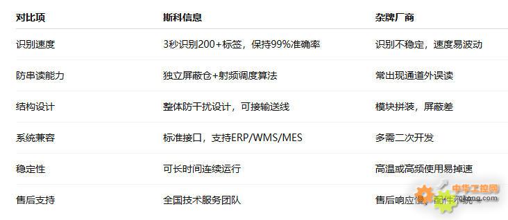 多数杂牌设备采用拼装模块方案,缺乏射频算法调优,容易出现漏读、串读、速度波动等问题。