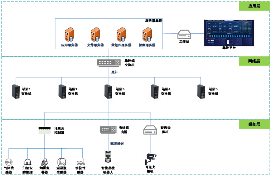 感知层:通过机器人配合分布式环境检测设备,完成对现场设备运行及环境状态的采集;