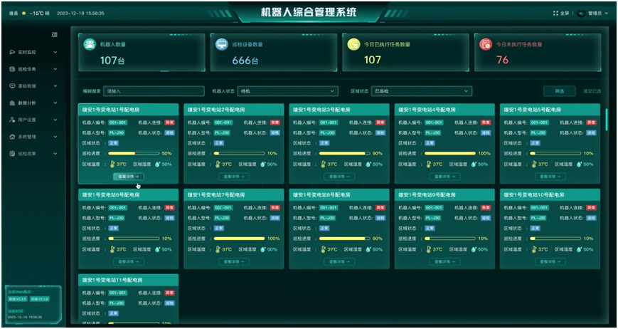 远程集控平台除了具备本地监控后台的具体功能外,最重要的一点是能管理多个本地监控后台;同时对多个AI巡检机器人进行控制及相关数据分析,对配电房进行更高层次的综合控制和管理。远程集控后台实现了集中模式下的全部功能特点,可控制其他巡检机器人做相应的动作和功能。