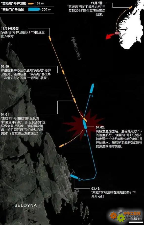 2018年11月8日凌晨4点,挪威"英斯塔"号宙斯盾护卫舰在完成任务回归途中,因夜间瞭望不足、值班人员误判与其它原因,无视对向来船与对方的多次避让警告,与油轮相撞致右舷撕裂。最终护卫舰应急搁浅,全体船员弃舰。造价5亿美元的军舰5天后沉没,成为全球首艘在役时沉没的宙斯盾舰。
