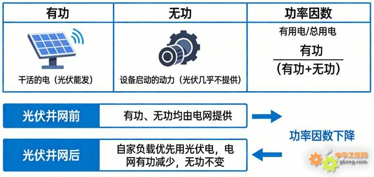 光伏并网后,自家负载优先用光伏的电,从电网取的有功大幅减少,但设备需要的无功一点没少。