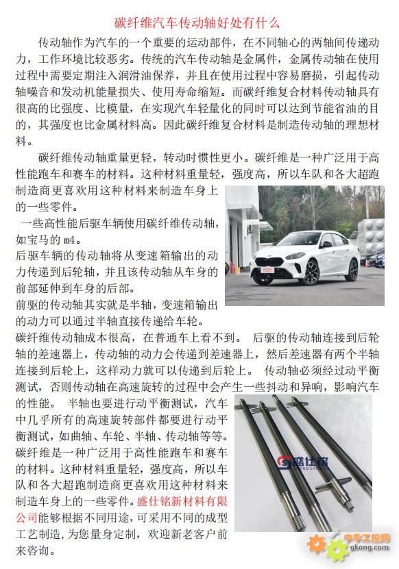 传动轴作为汽车的一个重要的运动部件,在不同轴心的两轴间传递动力,工作环境比较恶劣。传统的汽车传动轴是金属件,金属传动轴在使用过程中需要定期注入润滑油保养,并且在使用过程中容易磨损,引起传动轴噪音和发动机能量损失、使用寿命缩短。而碳纤维复合材料传动轴具有很高的比强度、比模量,在实现汽车轻量化的同时可以达到节能省油的目的,其强度也比金属材料高。因此碳纤维复合材料是制造传动轴的理想材料。