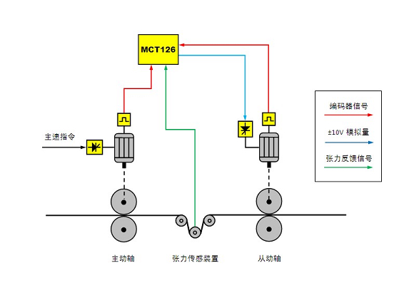 MCT126能方便地接入需要对张力进行控制的同步应用场合。MCT126独有模拟量相位修整模式,能接收张力反馈信号,自行控制物料的张力,无需增加额外的张力控制器对同步后的张力进行控制。