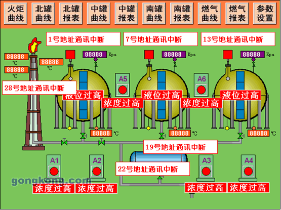 该安全监控系统不仅有数据实时显示功能,还有强大的报警功能,有通讯报警:当仪表与触摸屏通讯出现故障时,画面上出现相对应的通讯中断报警,用户可根据仪表地址对照表进行恢复;数据报警:对所有数值型数据有弹出式报警记录和警灯声音报警,如温度,压力,浓度,液位;其他报警:对所有显示状态的数据有对应的文字报警弹出和警灯声音报警,如各种开关量报警。