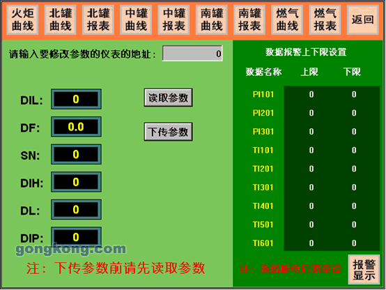 二 系统构成 整个系统由一台放置在安全区的嵌入式触摸屏电脑和现场多台宇电AI系列仪表构成。现场的宇电AI仪表通过各种传感器采集液化气罐及周边的数据,如:罐体压力,罐内液位,周边气体浓度,罐底及罐顶温度,燃烧口温度等数据。通过宇电AI仪表的RS485接口用把这些数据实时发送到触摸屏电脑进行处理,在画面流程图中显示实际位置的实时数据和实时报警,并可以同时发出声音报警,还可以把所有数据保存成文件,生成直观的实时曲线和历史曲线,供操作员参考。系统构成图如下: