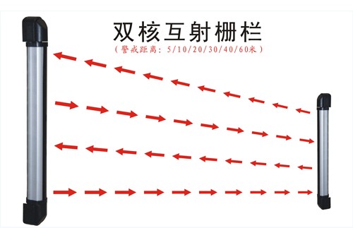 其工作原理如下图所示:发射端发出多束有效宽度为100mm的人视觉不可见 的防卫射束构成网状,接收端在收到防卫射束时,进入防卫状态。
