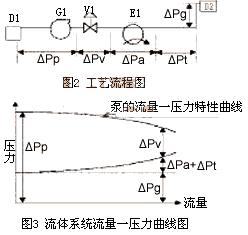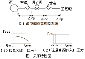 图4为一个简单而典型的调节阀流量控制系统。在该系统中,流量(包括最大流量和最小流量)和泵出口压力以及罐体入口压力的关系特性如图5中的(1)、(2)所示。