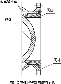 1.2阀瓣与阀杆采用三偏心结构阀门的阀瓣与阀杆采用三偏心结构设计,在关闭阀门的过程中,阀座与球体间的密封压力能够迅速增加,从而确保了密封副的可靠性。当阀门开启时,阀座与球体能迅速脱离,有效地减少了操作力矩,所以球体密封面不直接与阀体的密封面接触。采用这种结构形式,其密封面的磨损极小,不但密封性能很好,而且动作轻盈,操作灵活方便。1.3采用金属弹性密封圈结构阀座密封面采用金属弹性密封圈结构,当球体通过力矩传递至密封面时,使密封圈产生少量变形,达到密封目的,这种结构(见图2)仅用在温度较低的场合。