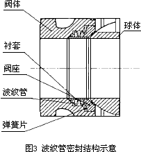 阀座密封面采用波纹管密封(见图3),除了有上述功能外,它还可以在高温情况下通过波纹管的变形来吸收热膨胀,因此该结构可以使用在温度较高的场合。