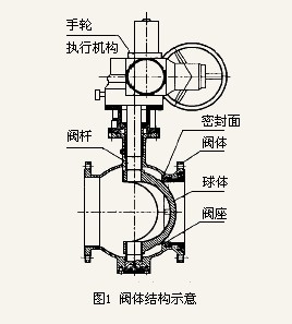 随着现代机械加工工艺和新材料的不断发展,球阀已不仅仅用在输送水、压缩空气等低温介质以及对密封性能要求较低的管道上,在石油化工、冶金、电力等行业中,球阀已被广泛应用在工艺条件要求苛刻、介质比较特殊的工业装置上。尤其是偏心金属硬密封球阀已被越来越多的人们所熟知和青睐。偏心金属硬密封球阀,根据球的形状可分为半球形和整球形两大类。本文主要就偏心半球形金属硬密封球阀的特点及应用作一介绍。 1偏心半球形金属硬密封球阀的结构特点 1.1 结构型式阀体采用整体式结构设计,阀杆与阀瓣采用三偏心结构,采用金属弹性密封固或波纹管密封,因此泄漏量少,安全可靠。另外手轮采用蜗轮蜗杆或气动(电动)传动机构。图1为其结构示意。