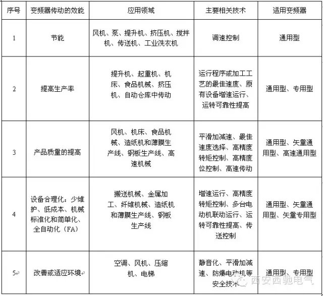 变频器和交流电机构成的可调速传动称为变频器传动,其功能用途如下。其中可能互为关联,实际上无明确分类,见下表,仅供参考。
