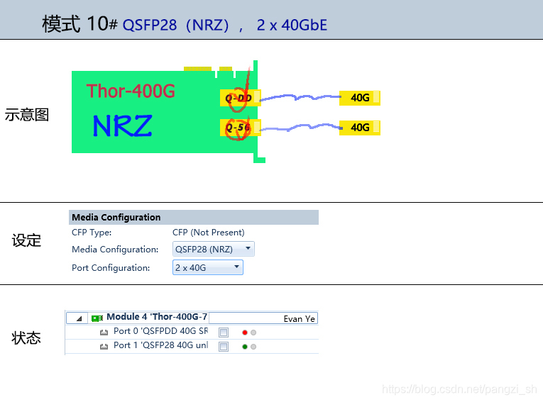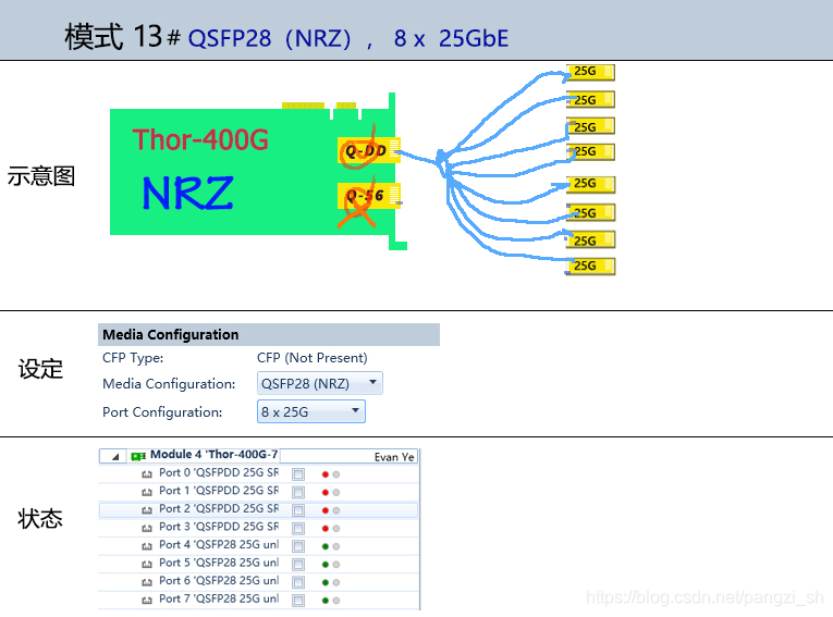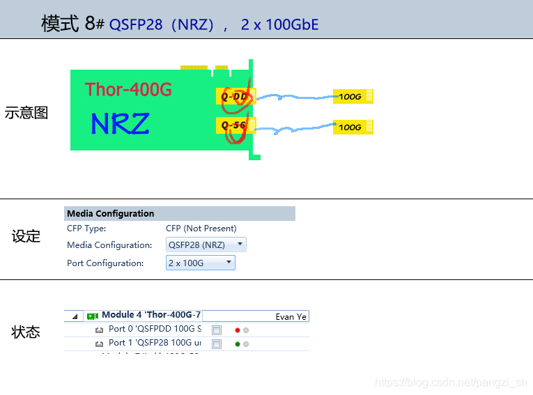 在THOR-400G-7S-1P测试板卡上提供了2个原生接口,一个为QSFP-DD,另一个为QSFP-56,具体使能模式为