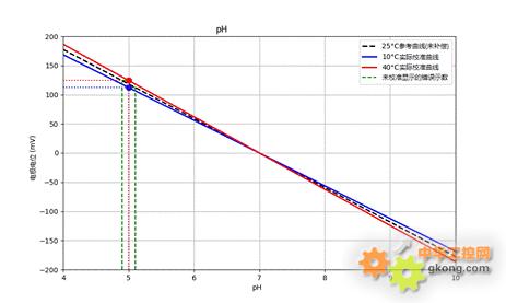 通常情况下,我们所描述的 pH值是指在特定环境温度下的酸碱性程度,如果温度不能确定则得出的 pH值也会失去参考意义,因此温度补偿是得出正确 pH值的关键环节。例如我现在在 10℃和 40℃下测量一个 pH=5的样本溶液,如果没有启用温度补偿 pH计就会按照默认 25℃的曲线来进行测量,所得出的结果也一定是不准确的。若启用了温度补偿,则是相当于 pH计在对应的温度下自身重新拟合了曲线,使得能斯特方程电极斜率发生了变化,此时再去测量 10℃和 40℃下的溶液得出的 pH值就是准确的,如图 3所示。