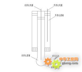 温度补偿是指对 pH电极本身的测量信号进行温度校正的过程, pH电极的斜率会随着溶液温度的变化而变化,这符合能斯特方程。温度补偿的目的是确保在任何温度下, pH计都能将电极产生的毫伏信号准确地转换为正确的 pH值读数。 pH计一般采用电位法的原理,通常使用复合电极来测量被测溶液中的 H+离子浓度值,复合电极结构如图 1所示。电极探头分为指示电极和参比电极两部分,参比电极一般采用银 /氯化银电极,它对溶液中的 H+离子活度无影响,且具有恒定的电极电位;指示电极是由对 H+离子反应灵敏的玻璃探头构成的。在测量的过程中 H+离子浓度的不同会使得指示电极和参比电极之间形成与 H+离子浓度对应的电位,只要测量出这个电位值,便可以得出被测溶液的 pH值。