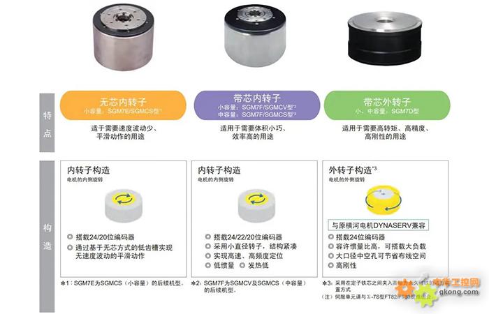 带芯外转子SGM7D系列:以高刚性、高惯性为核心优势,容许负载转动惯量比显著优于行业标准,大口径中空孔设计为布线配管提供便利。其外径107-264mm,额定转矩1.3-240N?m,最大转矩400N?m,适配划线机、液晶涂布机等重载精密设备,且与原横河电机DYNASERV系列兼容,降低设备升级成本。?