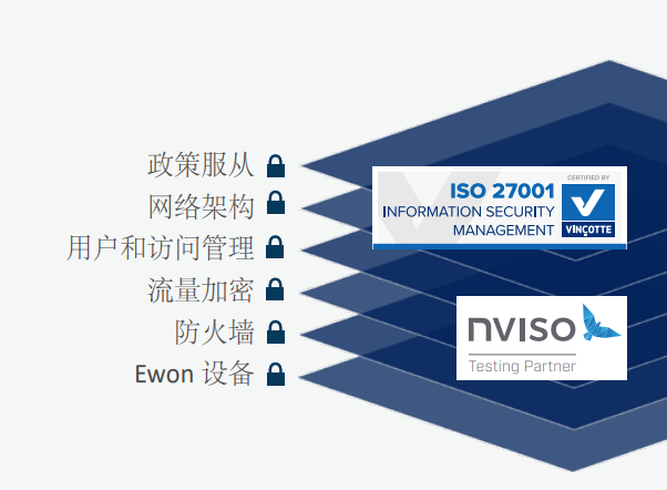 Ewon 远程访问采用纵深防御安全方法(Defense-in-Depth Approach),将 ISO 27001 信息安全标准、IEC 62443 工业网络安全框架及 NIST 网络安全准则深度融合,打造覆盖设备、网络、系统三层的立体防护体系。