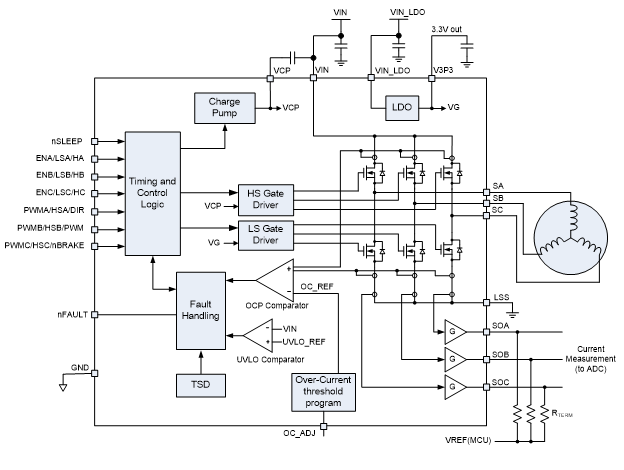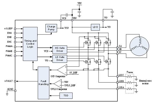 为了便于控制,MP6543支持PWM与ENBL输入,支持霍尔信号输入,内置3.3V/100mA LDO调节器,支持内部充电泵100%占空比工作,具备自动同步整流功能。