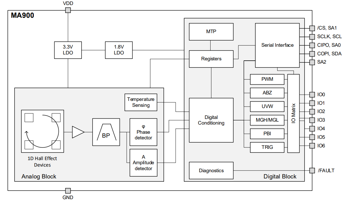 MA900提供两种供电电压,3V至3.6V和4.5V至5V。通信接口支持SPI、I²C、ABZ、PWM、UVW、SSI、SENT,可适配多种电压与通信协议场景。在故障检测方面,MP900还可配置磁场强度检测,便于诊断检查。