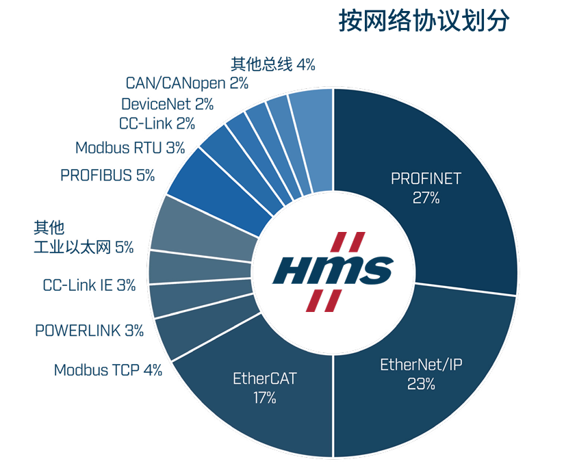 主流协议三强鼎立:PROFINET(27%)、EtherNet/IP(23%)和 EtherCAT(17%)成为市场份额最高的三种工业以太网协议。