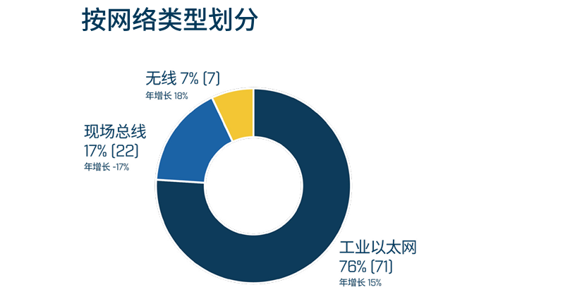 现场总线持续收缩:传统现场总线市场份额降至 17%,显示出被以太网技术加速替代的趋势,其主要应用集中于现有设备的维护与特定场景。
