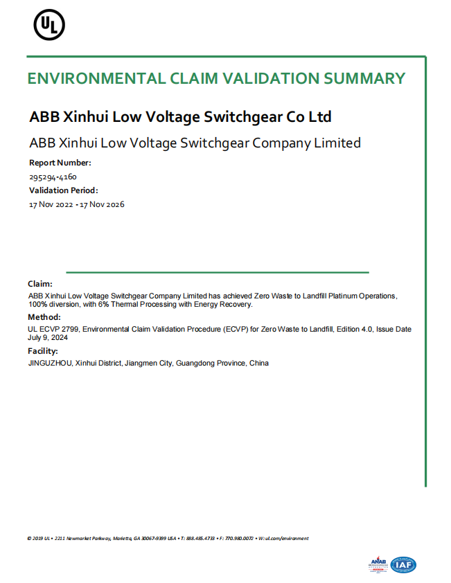 近日,ABB新会低压开关有限公司通过UL 2799废弃物零填埋“铂金级”认证,这是ABB智慧电力业务在华获得的第二张“铂金级”证书,也是ABB在华获得的第五张UL 2799证书。此前,基于UL 2799标准,北京ABB低压电器有限公司、厦门ABB低压电器设备有限公司、北京ABB开关有限公司取得废弃物零填埋“铂金级”认证,厦门ABB开关有限公司取得“金级”认证。
