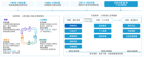 据亿欧智库梳理,人形机器人在产业应用阶段,有望在细分市场率先商业化,如工厂生产、安防巡检、物流配送、服务业引导等。中期逐步成熟转为通用型机器人,进入家政等市场。而在更远的未来,人形机器人则有望应用于航天航空领域。