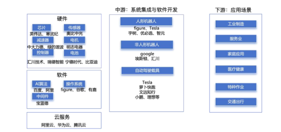 具身智能产业链属于典型的“金字塔”结构。由上游核心零部件和关键技术、中游系统集成与软件开发、下游应用场景构成。