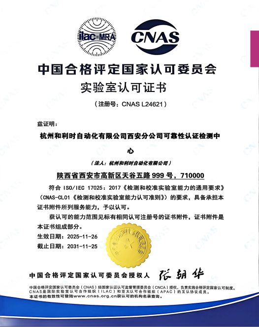 近日,杭州和利时自动化有限公司西安分公司可靠性认证检测中心(以下简称:可靠性实验室)顺利通过中国合格评定国家认可委员会(CNAS)评审,符合ISO/IEC 17025《检测和校准实验室能力的通用要求》管理体系和质量体系要求,正式获得CNAS实验室认可资质(证书号:CNAS L24621)。