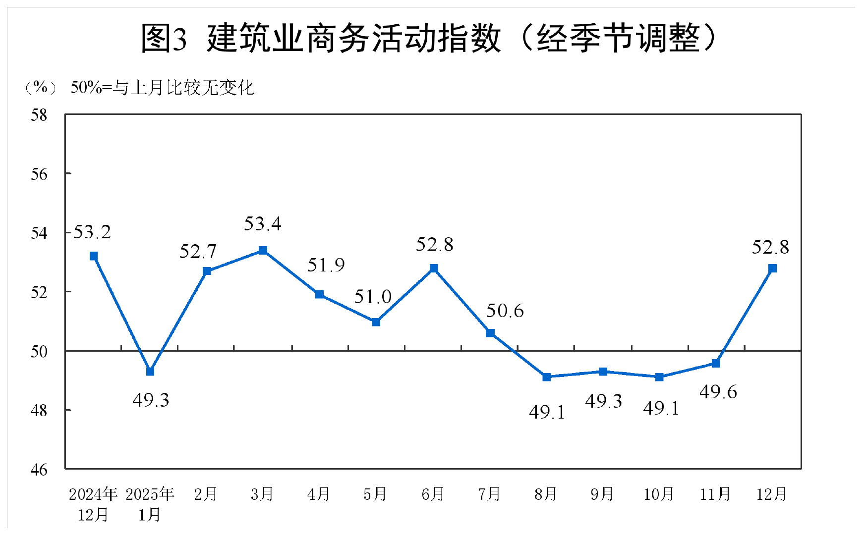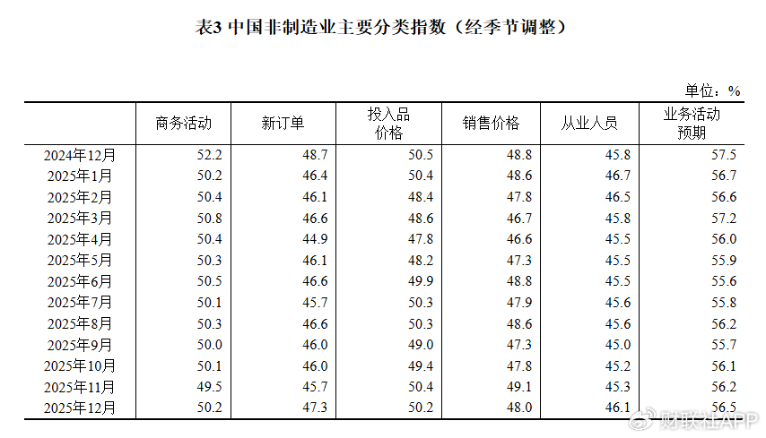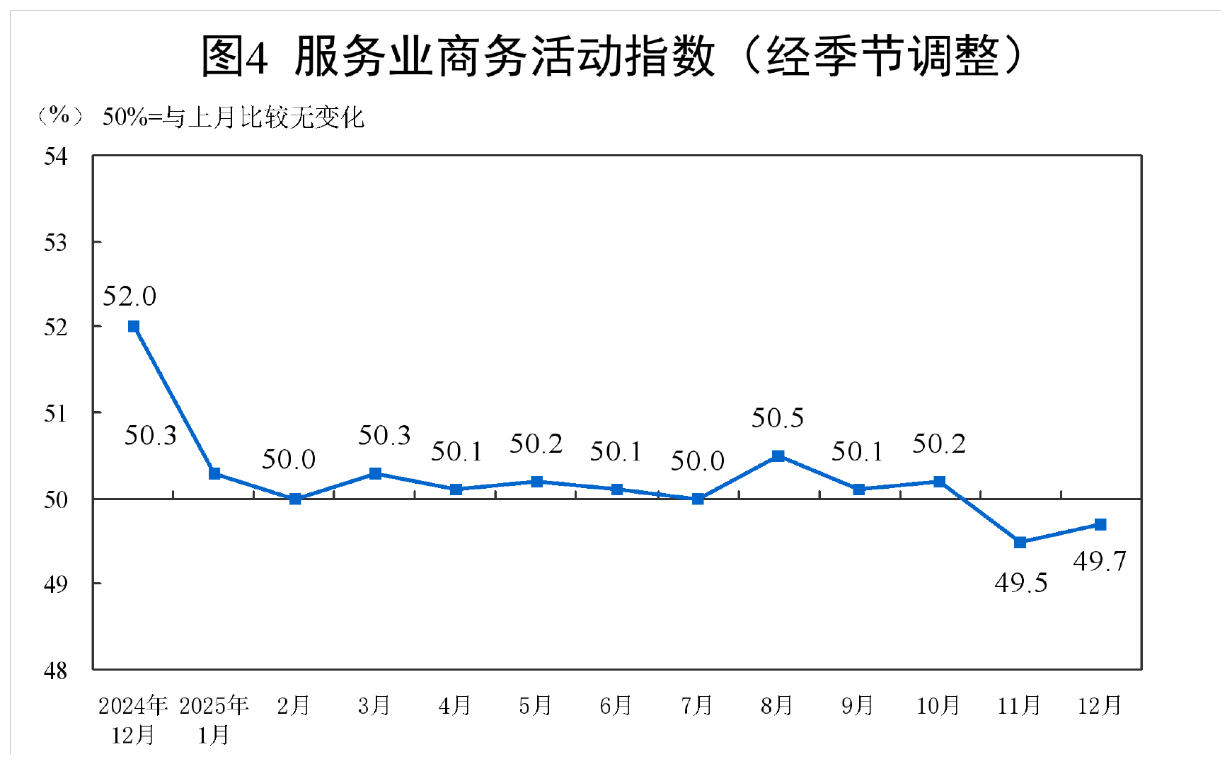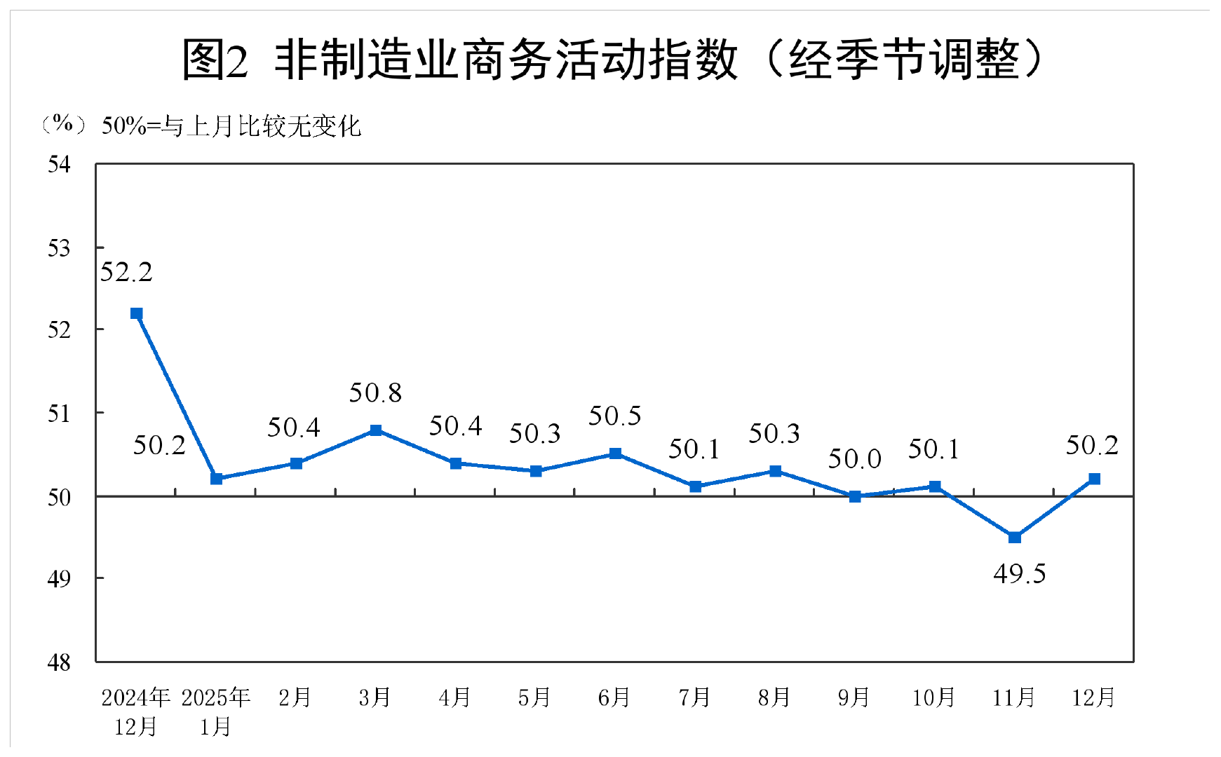 12月份,非制造业商务活动指数为50.2%,比上月上升0.7个百分点,重返扩张区间。
