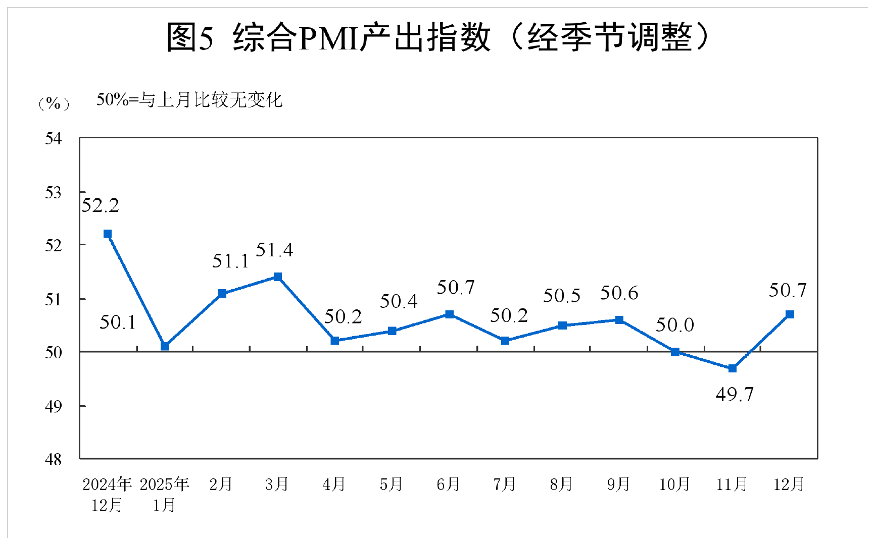 12月份,综合PMI产出指数为50.7%,比上月上升1.0个百分点,表明我国企业生产经营活动总体较上月扩张。