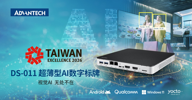 近日,研华科技(Advantech)旗下DS-011系列产品凭借其在超薄节能Edge AI计算设计领域的创新实力,荣获2026年度台湾精品奖。该产品可为数字标牌及7*24小时持续运行的边缘部署场景提供高效可靠的计算平台。