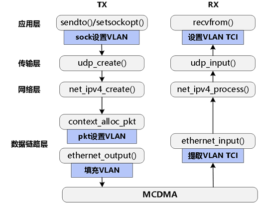 第三步,将RTOS的网络协议栈与TSN的核心协议融合,确保RTOS支持TSN的关键特性,包括优先级调度、VLAN标记和优先级映射等。如图8所示,我们对RTOS的网络协议栈做了以下修改: