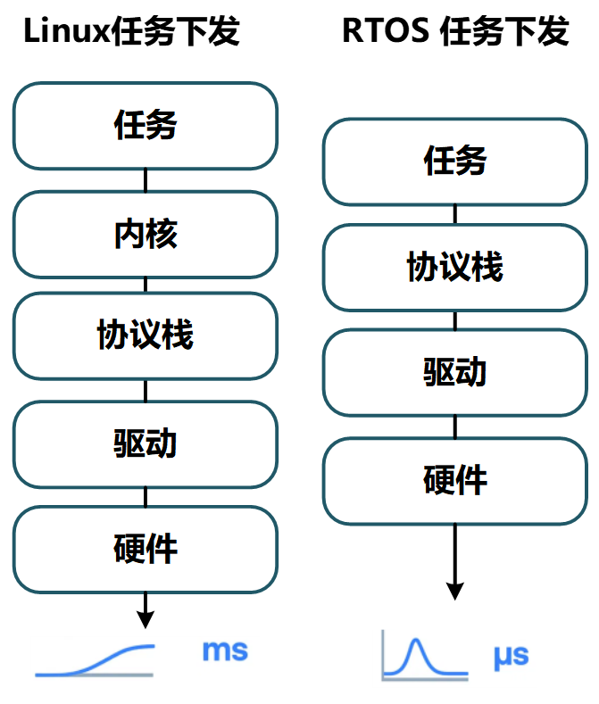 1、任务从OS到硬件队列这条路线的时间短。如图1所示,Linux的任务经常横跨用户空间和内核空间,包括协议栈、skb缓冲、驱动等,每一层都可能产生延迟和不可预测的抖动。相比之下,RTOS路径极短,任务通过协议栈直接访问驱动、驱动直接写硬件寄存器,整个链路几乎是一条直通链,没有用户态/内核态切换带来的延迟,提升了配置下发的实时性。