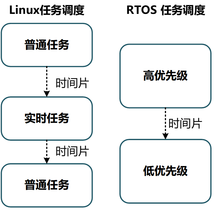 2、调度时间片与 GCL 时隙的精准匹配。TSN的GCL是区别其他确定性以太网的核心所在,TSN IP核的GCL时隙通常在10–100微秒。图2展示了Linux与RTOS的任务调度对比,Linux本身的最小调度时间片普遍在1ms以上,即便打了RT补丁,也很难稳定到500µs以下;而RTOS的调度时间片完全可以做到100微秒甚至10微秒,这就与TSN的 GCL时隙(10–100微秒)匹配上了,确定性就更有保障。