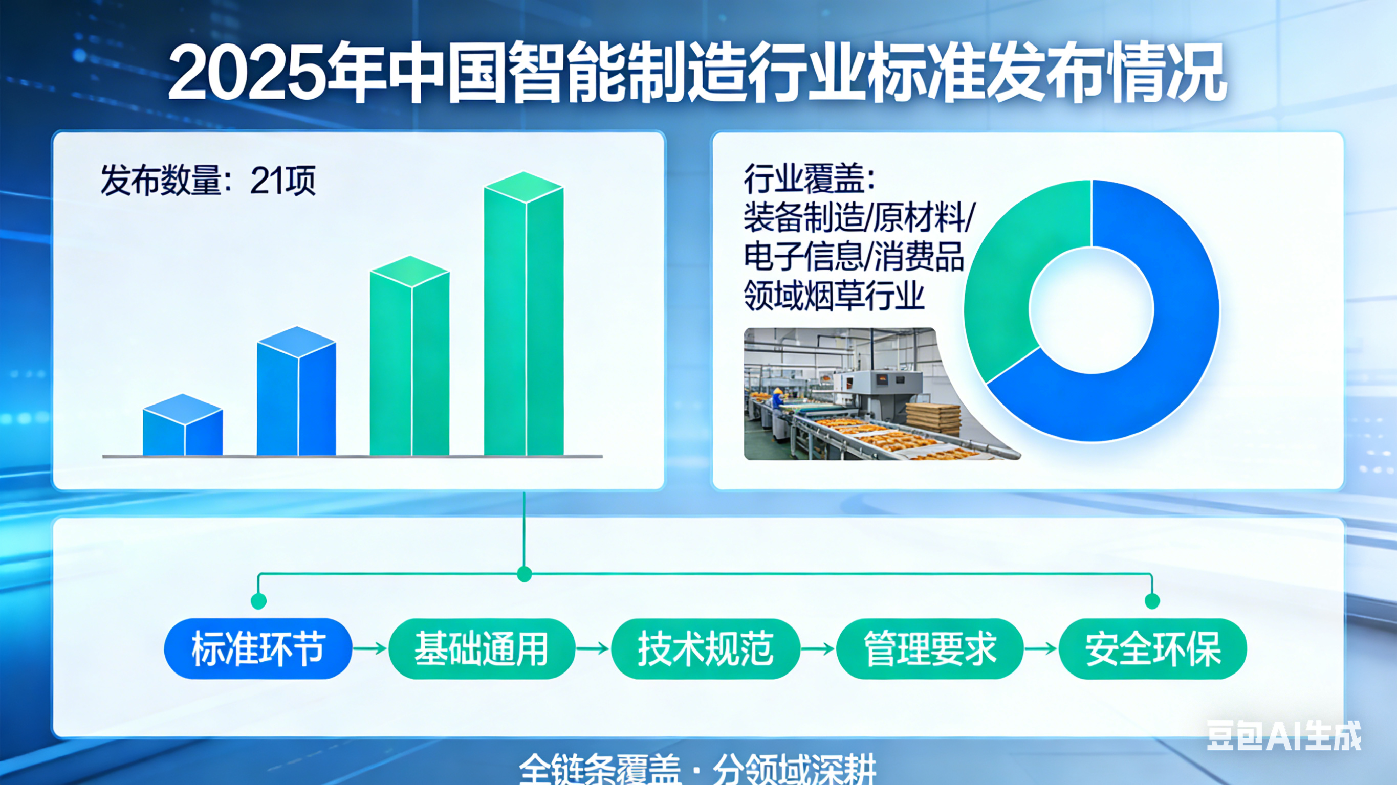 2025年智能制造行业标准密集出台,我国标准体系迈向应用深化新阶段 2025年我国智能制造行业标准发布量激增,累计达21项,覆盖机械、电子、钢铁等关键行业及核心环节,呈“全链条覆盖、分领域深耕”特征。各领域标准精准破解转型痛点,与国家战略呼应,破解“数据孤岛”难题,标志标准体系迈向应用深化,为新型工业化和新质生产力培育提供支撑。(阅读原文) |