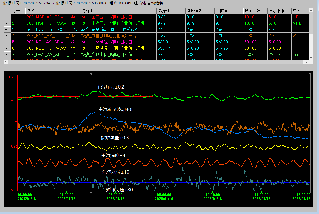 下图为和利时智能优化控制系统投入后锅炉主汽压力、氧量、主汽温度等主要运行参数的趋势图。
