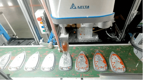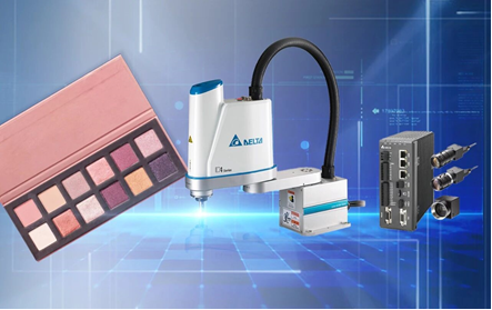 台达采用SCARA机器人与机器视觉系统相结合的方案,在高速运行的输送线上,以±0.1mm的抓取精度,将不同颜色的粉饼快速放入对应的粉饼盒中,实现生产质量与运行效率双提升。