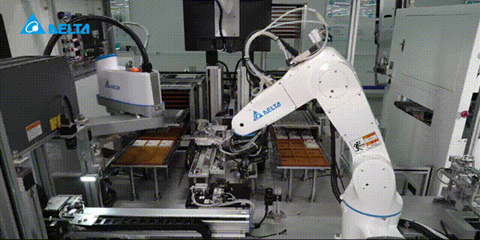 台达采用多关节机器人DRV系列与SCARA机器人DRS系列模拟人工“双手协作”模式,通过视觉系统实现快速点位补正与高精度对位,两台机器人可协同完成插装、锁付、检测等复杂工序,大幅提升组装精度。